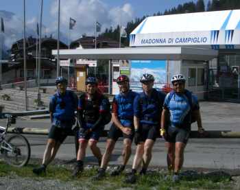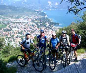 Heute scheint uns das Wetter besser gesonnen zu sein. Vor dem Abfahren hat es zwar noch geregnet, aber dann hatten wir den ganzen Rest des Tages Sonne. Wir fuhren hinunter bis nach Zuclo, um dann mit dem Passo Duron unseren letzten größeren Anstieg in Angriff zu nehmen. Danach wieder hinunter zum Tennosee, um über Campi noch auf einem schönen Gardaseetrail - dem Sentiero 402 - nach Riva abzufahren. Am Ortsschild von Riva kam dann das obligatorische Bild, bevor wir uns am Hafen einen Riesen-Eisbecher gönnten. Im Hotel „Fontanella“ angekommen, hätte das Timing nicht besser sein können, bog doch schon kurz darauf Alfred Keck mit dem VW-Bus um die Ecke, der uns abholte. Neben den Care-Paketen mit frischer Wäsche brachte er auch schön gekühltes Farny-Weizen mit, so dass wir unseren Sieg über die Alpen gebührend feiern konnten. Nach über 10.000 Höhenmetern war zwar keiner mehr taufrisch, doch alle haben es geschafft und sind gesund, ohne größere Verletzungen und vor allem ohne Pannen am Gardasee angekommen - und das ist schließlich das Wichtigste!